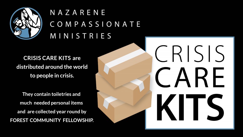 We are always in need of supplies for Crisis Care Kits which are distributed around the world in times of crisis and need. Basic items include: shampoo, soap, toothpaste, toothbrushes, bandaids, fingernail clipper, comb, hand towels, kleenex, and a small, stuffed toy.